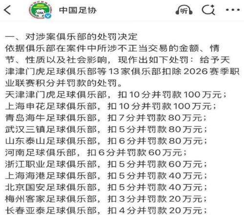 上海申花与天津津门虎双双领到顶格罚单:新赛季初始积分为-10分,并各被处以100万元罚款。