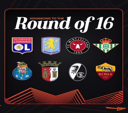 直通欧联16强的8支球队:里昂、阿斯顿维拉、中日德兰、皇家贝蒂斯、波尔图、布拉加、弗赖堡、罗马