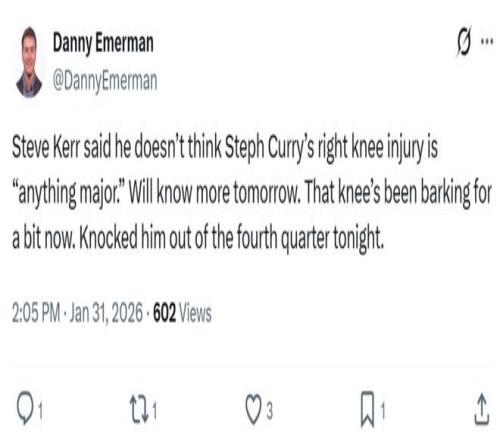 比赛第三节还剩4分多钟时,库里因右膝酸痛提前退出比赛,并缺席末节争夺,赛后湾区媒体95.7 The Game晒出库里在场边的画面。